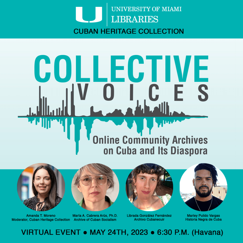 Conversatorio virtual organizado por la Colección Cubana de la Universidad de Miami entre tres archivos comunitarios que preservan la historia de Cuba. Panelistas: Marley Pulido de Historia Negra de Cuba, Maria Antonia Cabrera Arus de Cuba Material, y Librada González Fernández de Archivo Cubanecuir.